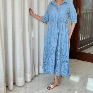 Design details: A vibrant cobalt blue tiered dress with a relaxed fit. Features a collared V-neckline and puffed short sleeves, adding a touch of volume and style.