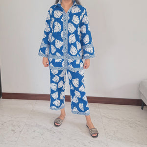 Blue and White printed set includes shirt and culottes with scallop detailing. Suitable for summers.