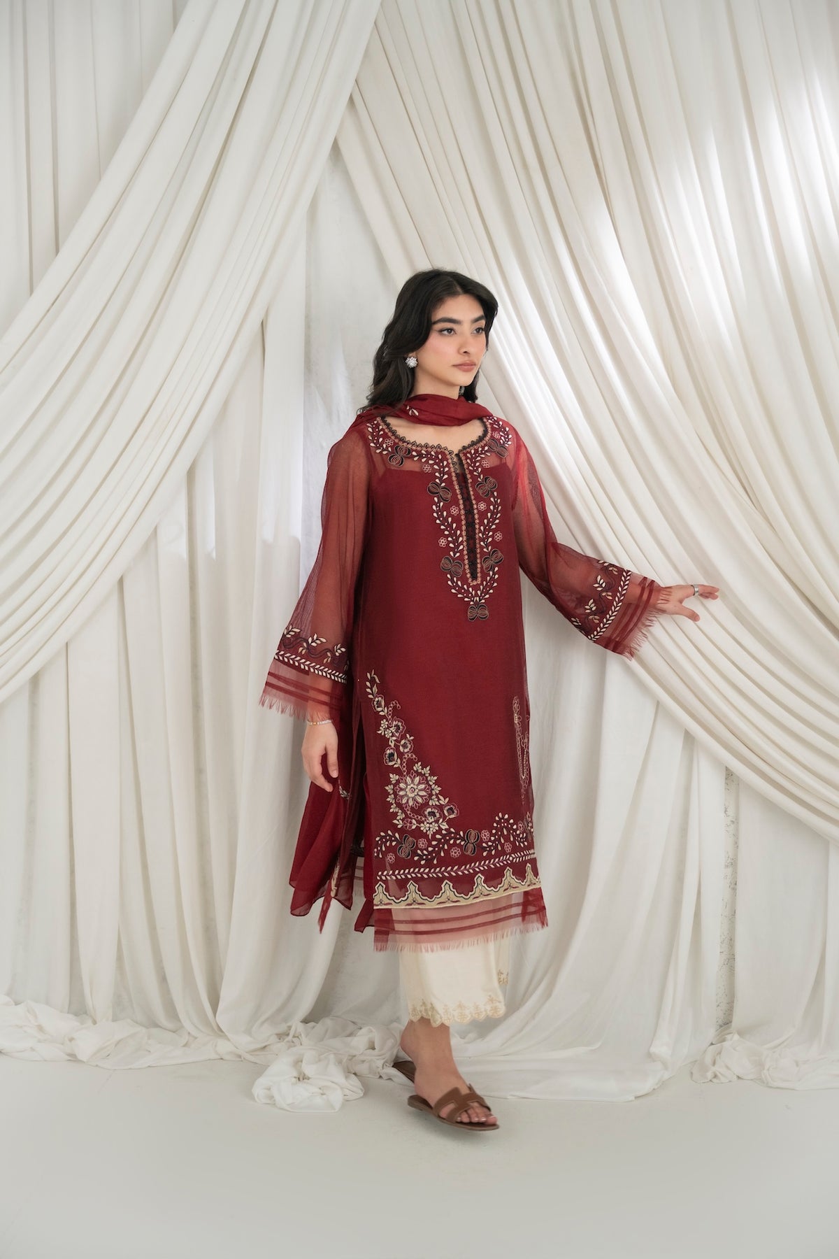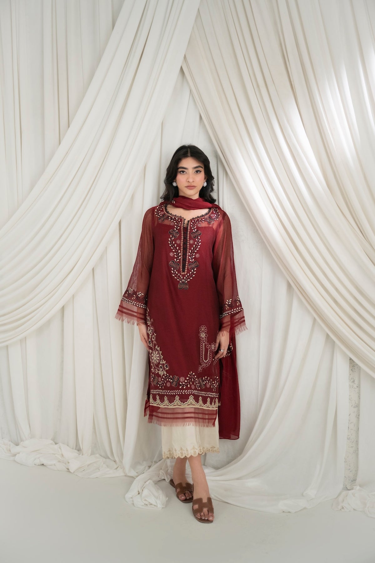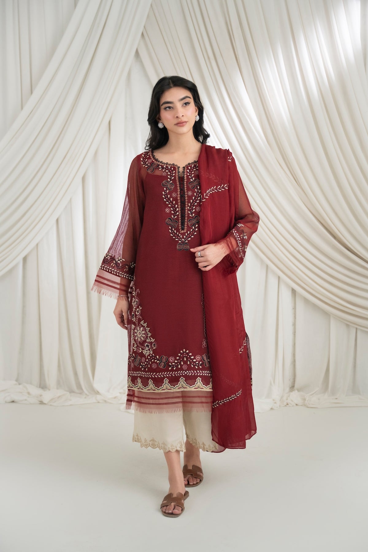 This set features a deep maroon cotton net shirt with intricate embroidery detailing, paired with khaadi silk pants. The look is completed with an embroidered dupatta.