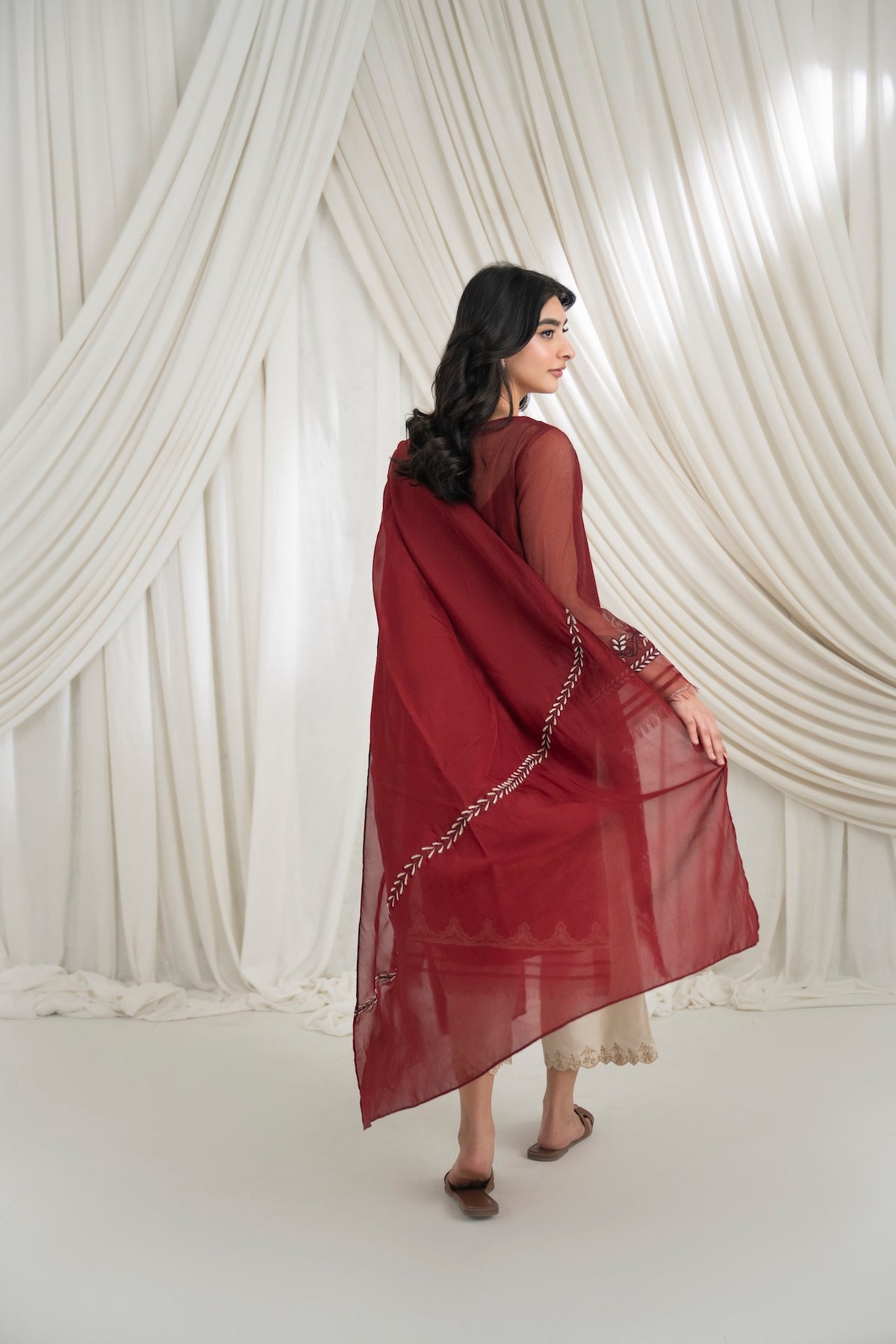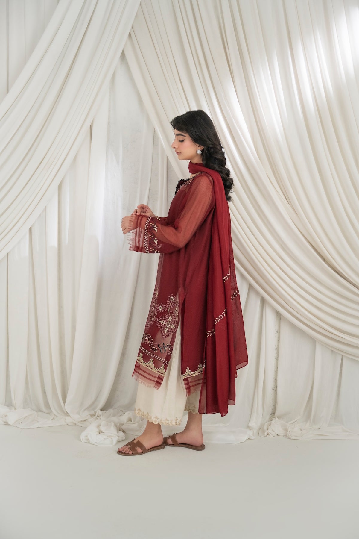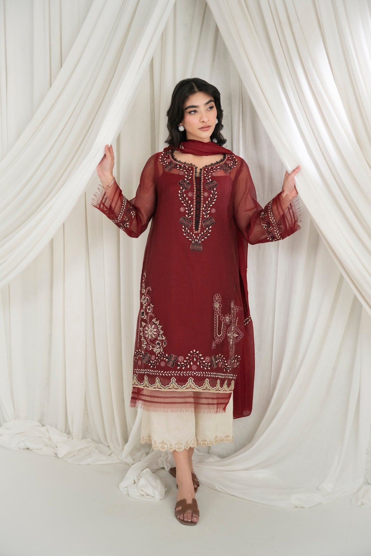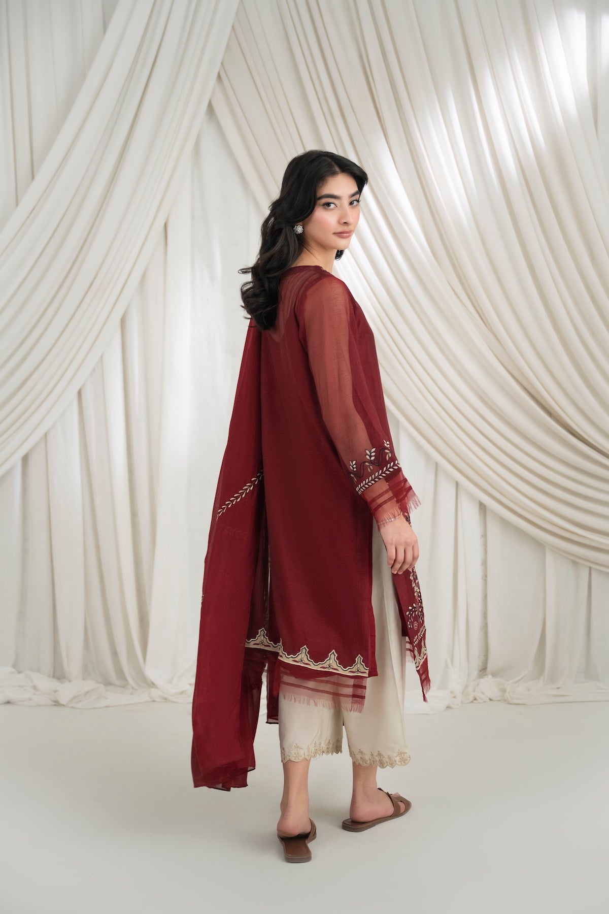 This set features a deep maroon cotton net shirt with intricate embroidery detailing, paired with khaadi silk pants. The look is completed with an embroidered dupatta.