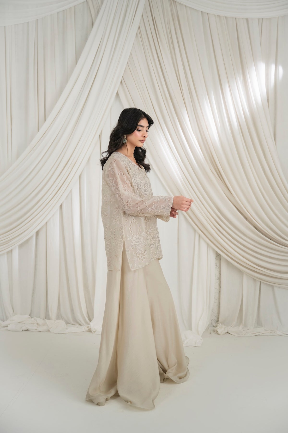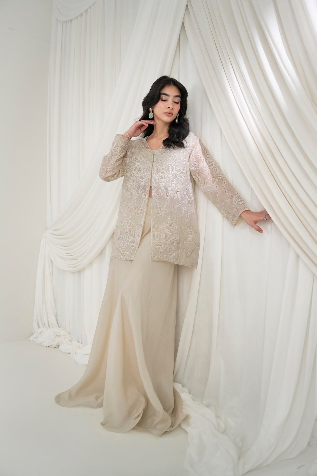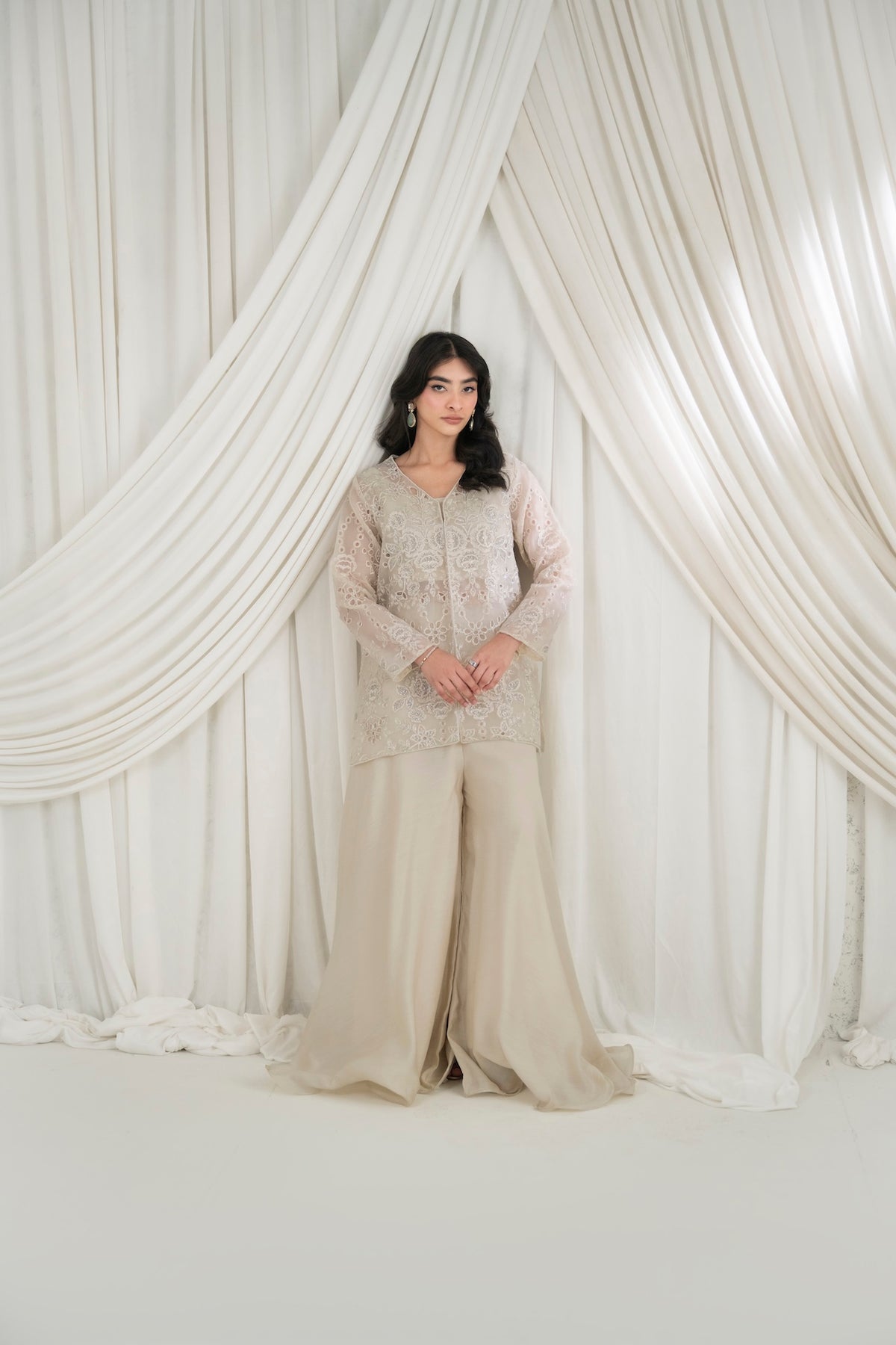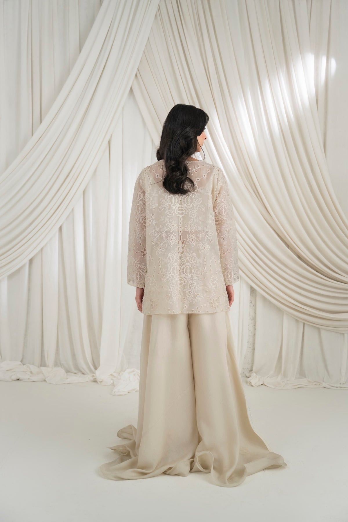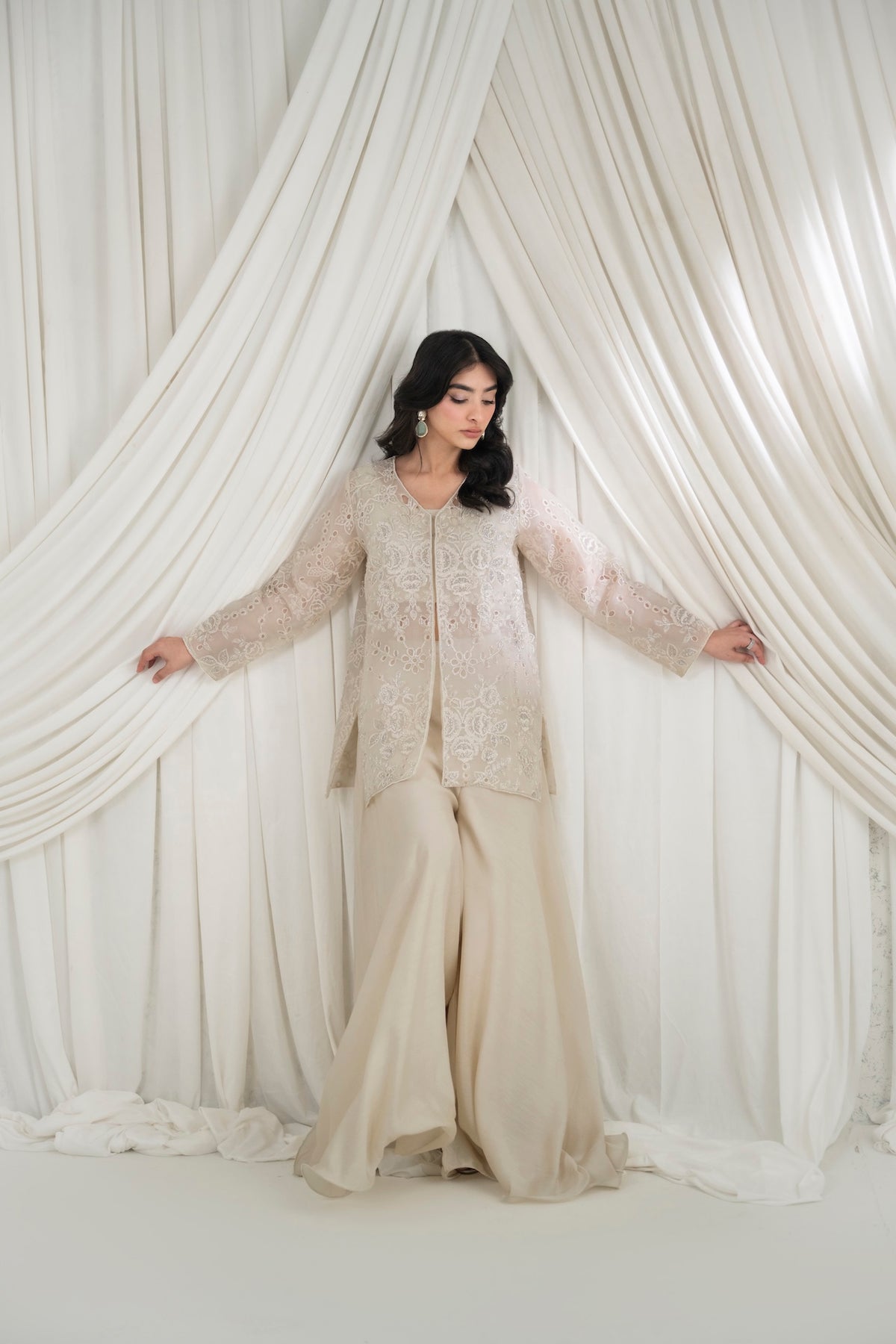 A refined cutwork embroidered organza jacket adorned with delicate hand embellishment, layered over a tube top and paired with flared khadi silk pants. The pants are lined for comfort and structure.