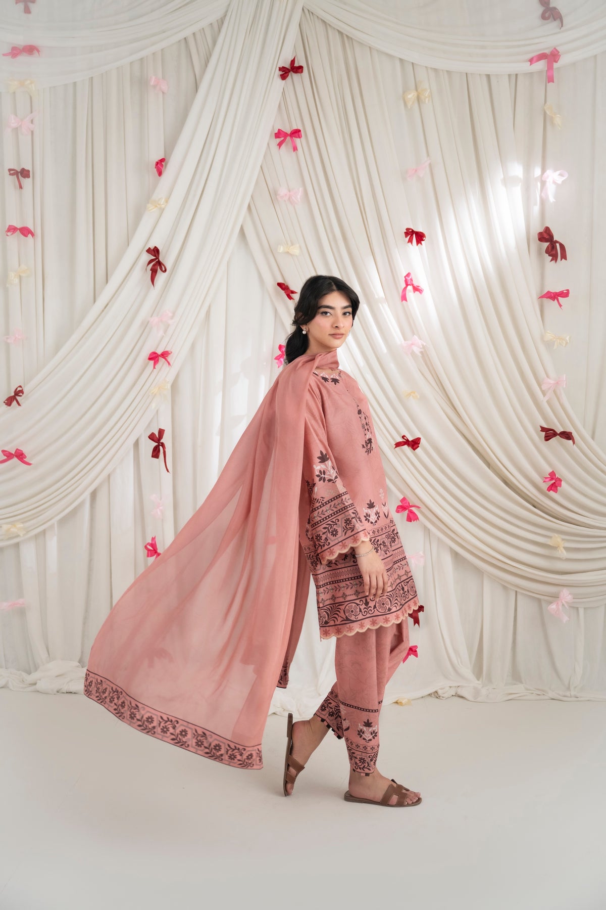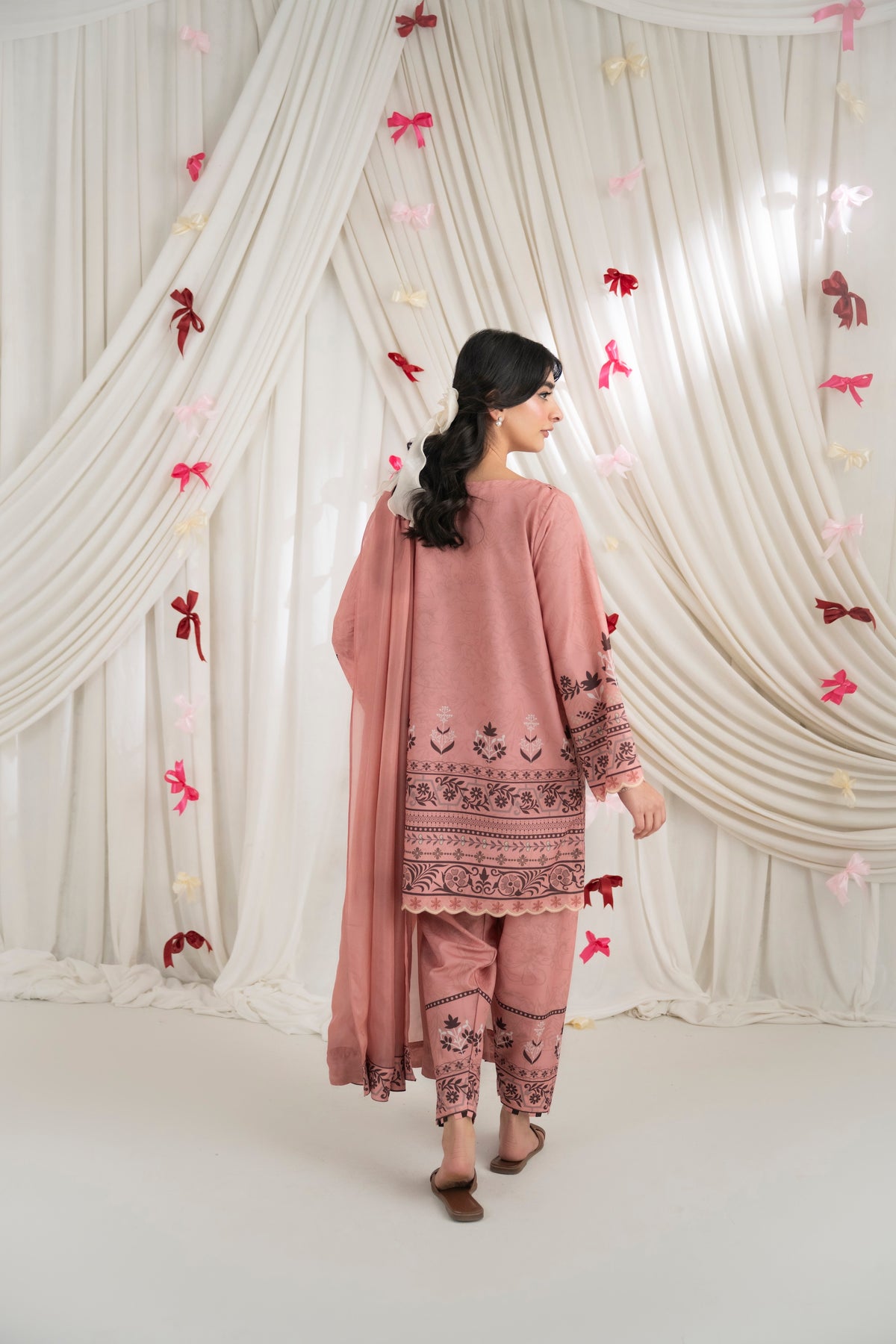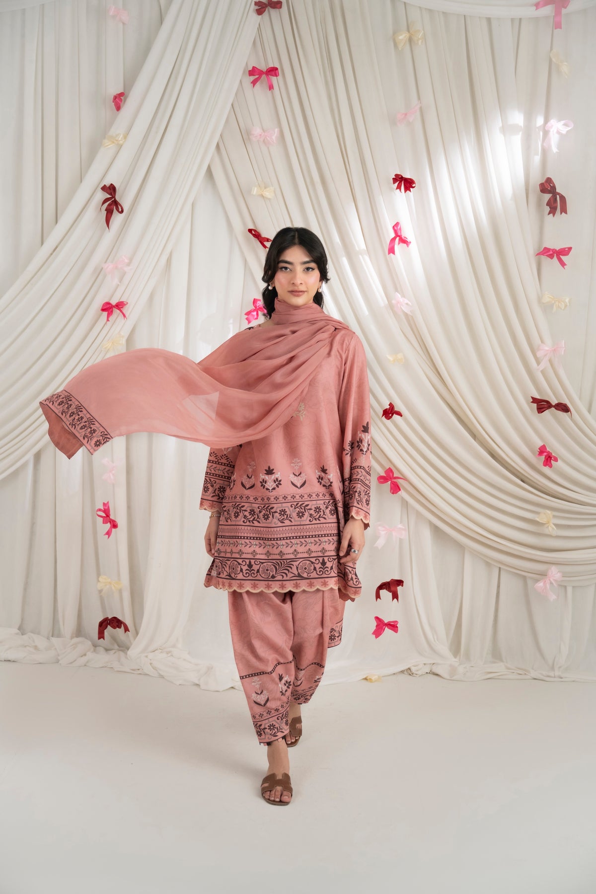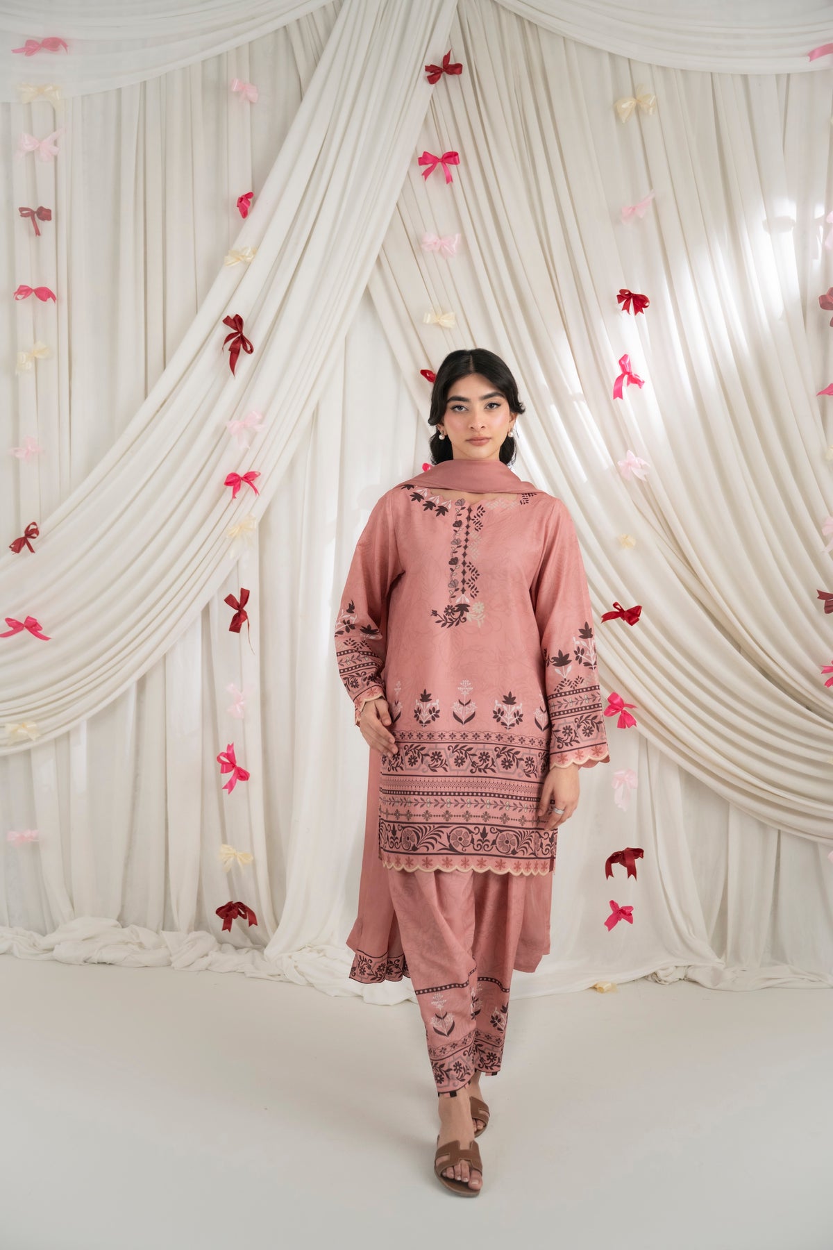 LOLITA – Dusty Rose A printed two-piece set in dusty rose, featuring delicate floral and traditional motifs along the neckline, sleeves, and hem. Paired with matching skinny shalwar for a coordinated look, and complemented with a soft matching dupatta.