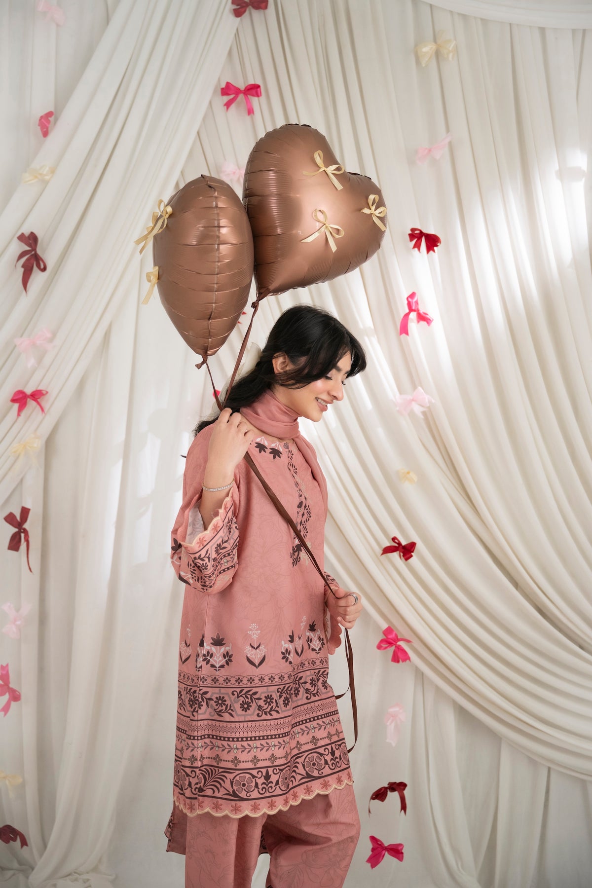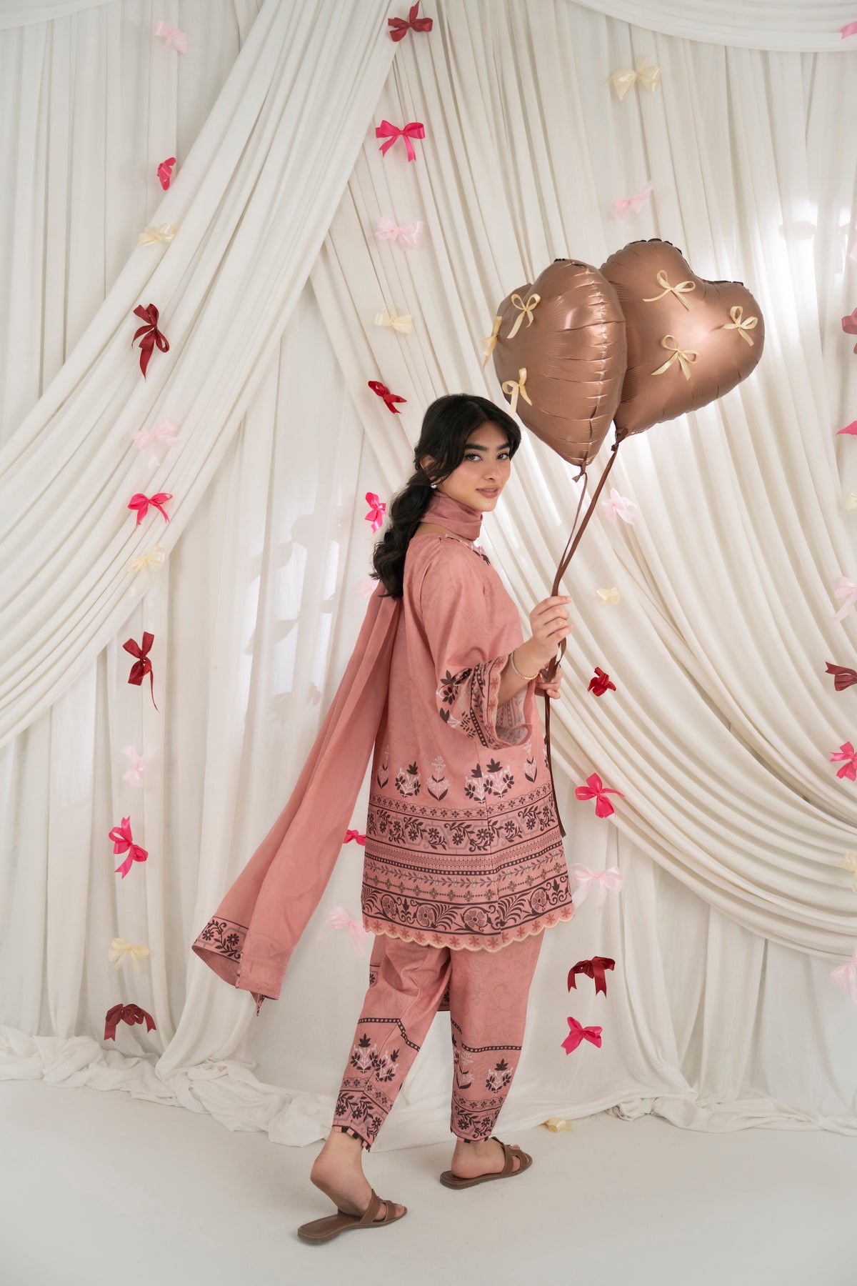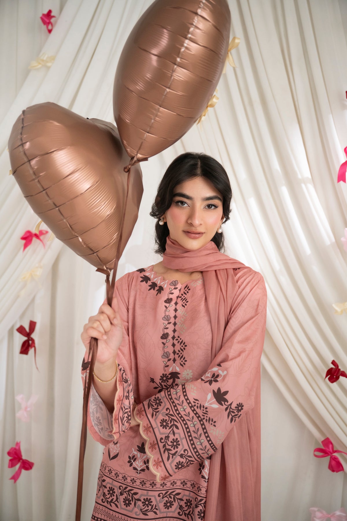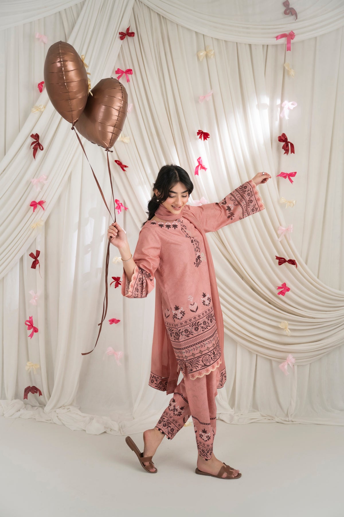 LOLITA – Dusty Rose A printed two-piece set in dusty rose, featuring delicate floral and traditional motifs along the neckline, sleeves, and hem. Paired with matching skinny shalwar for a coordinated look, and complemented with a soft matching dupatta.