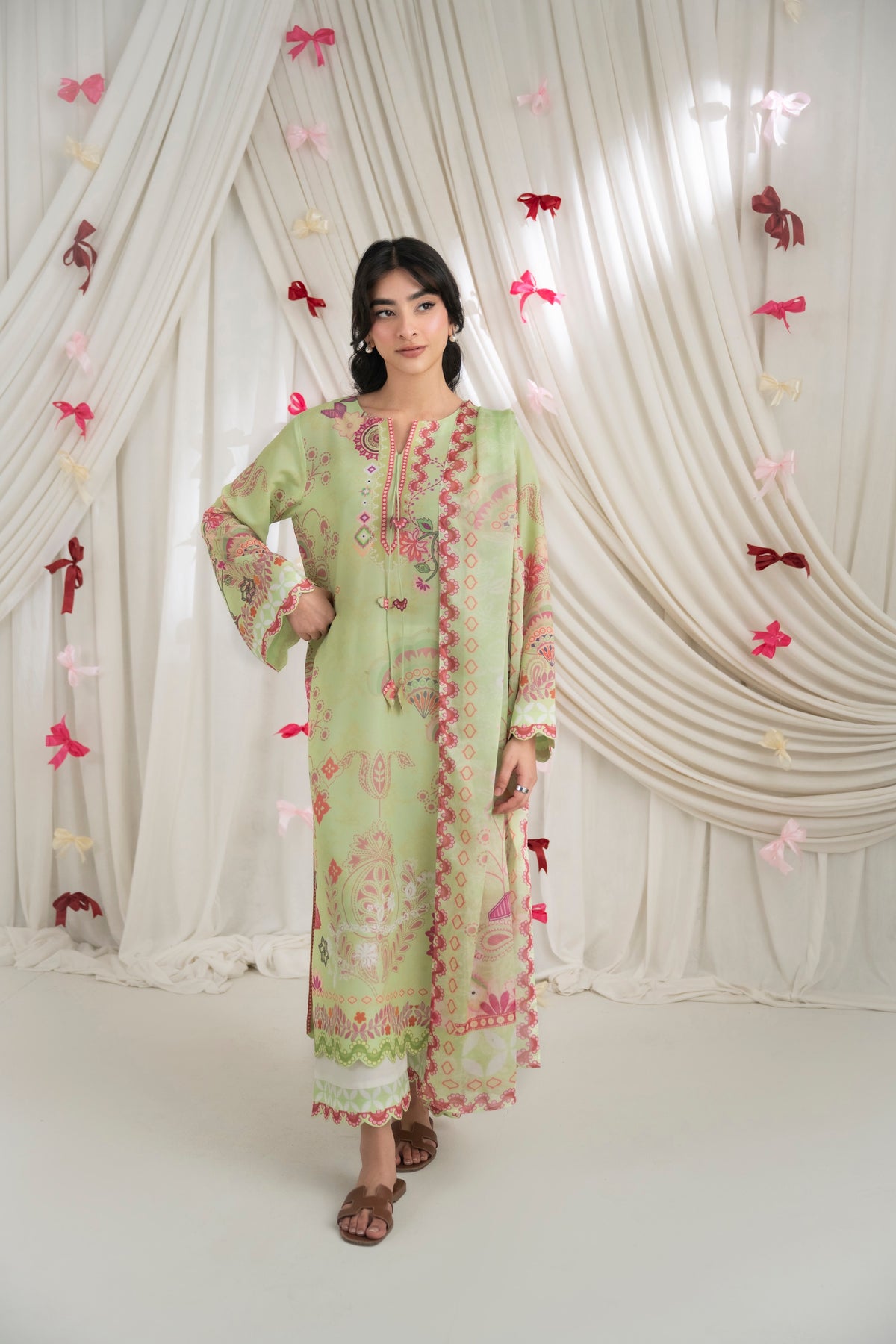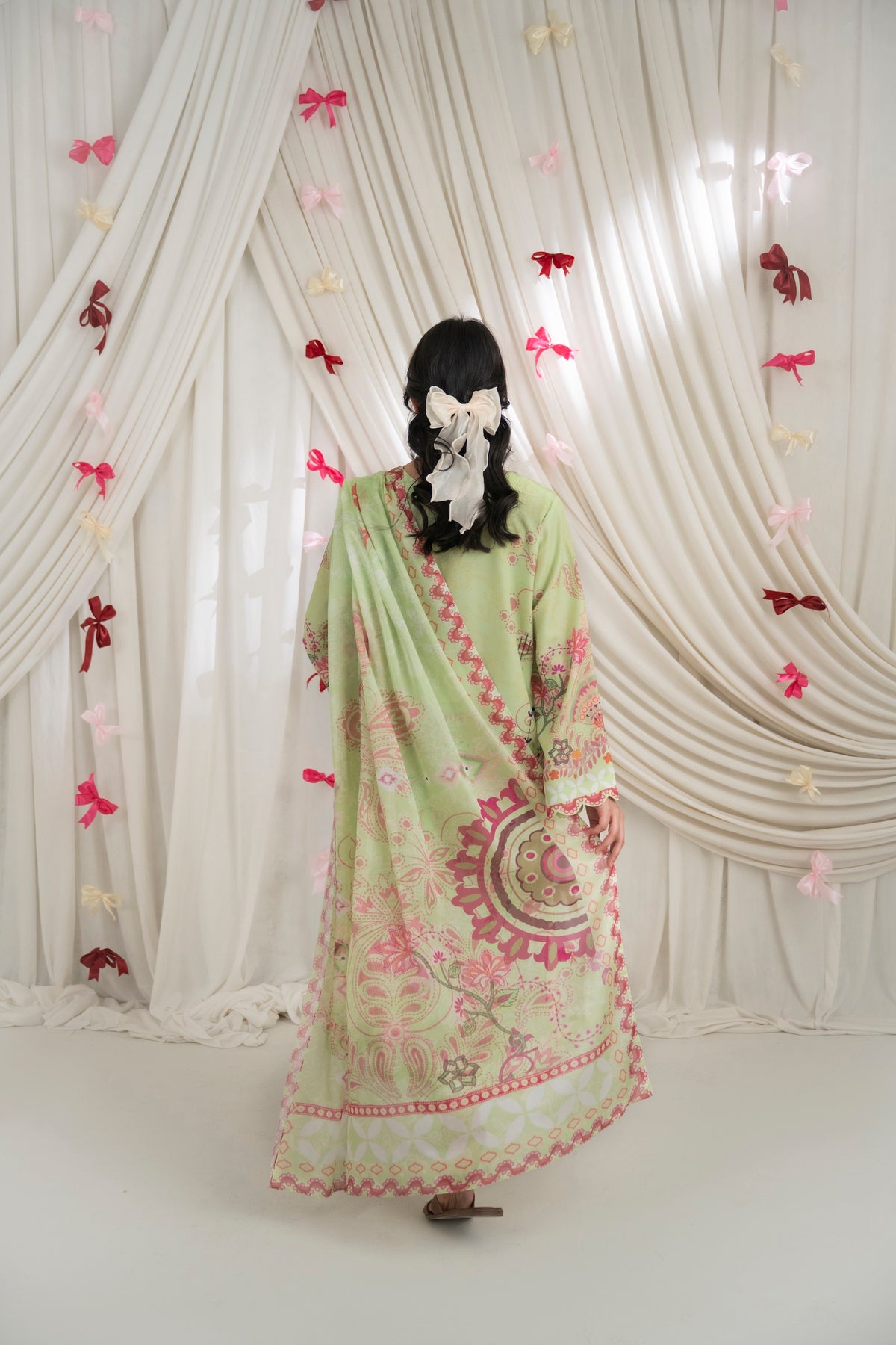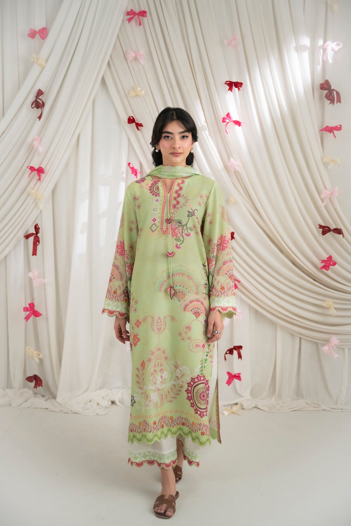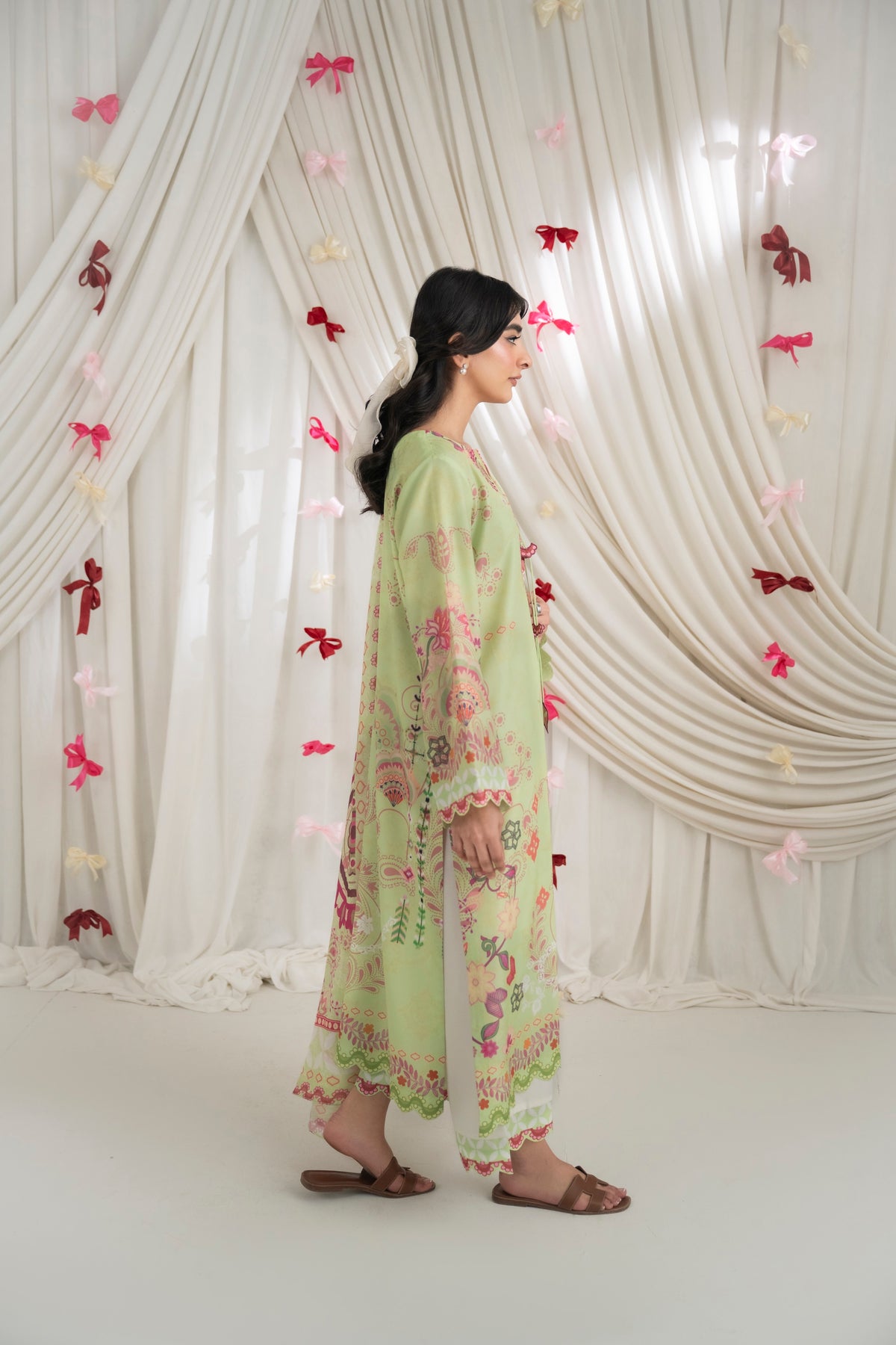 POPPY – Pistachio Green A vibrant printed two-piece set in pistachio green, featuring floral and traditional motifs, paired with matching pants. Perfect for effortless summer styling.