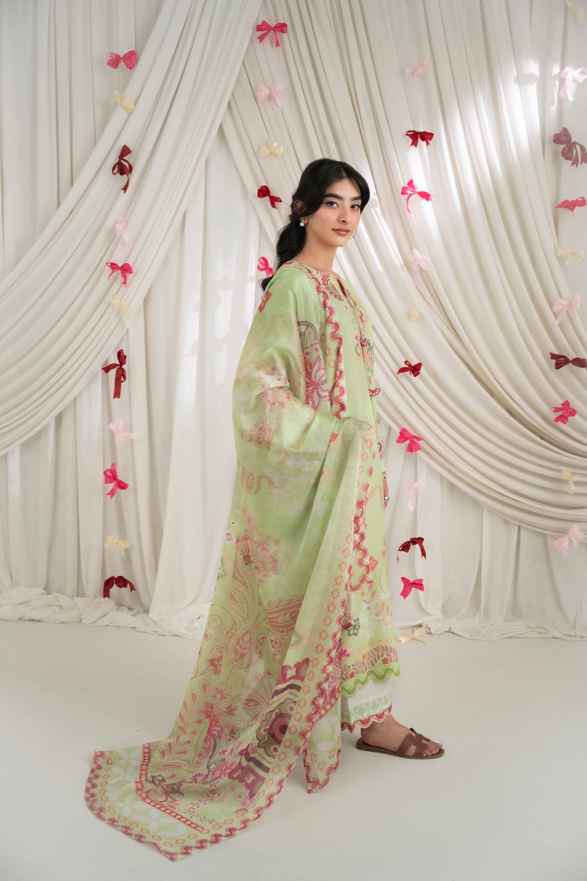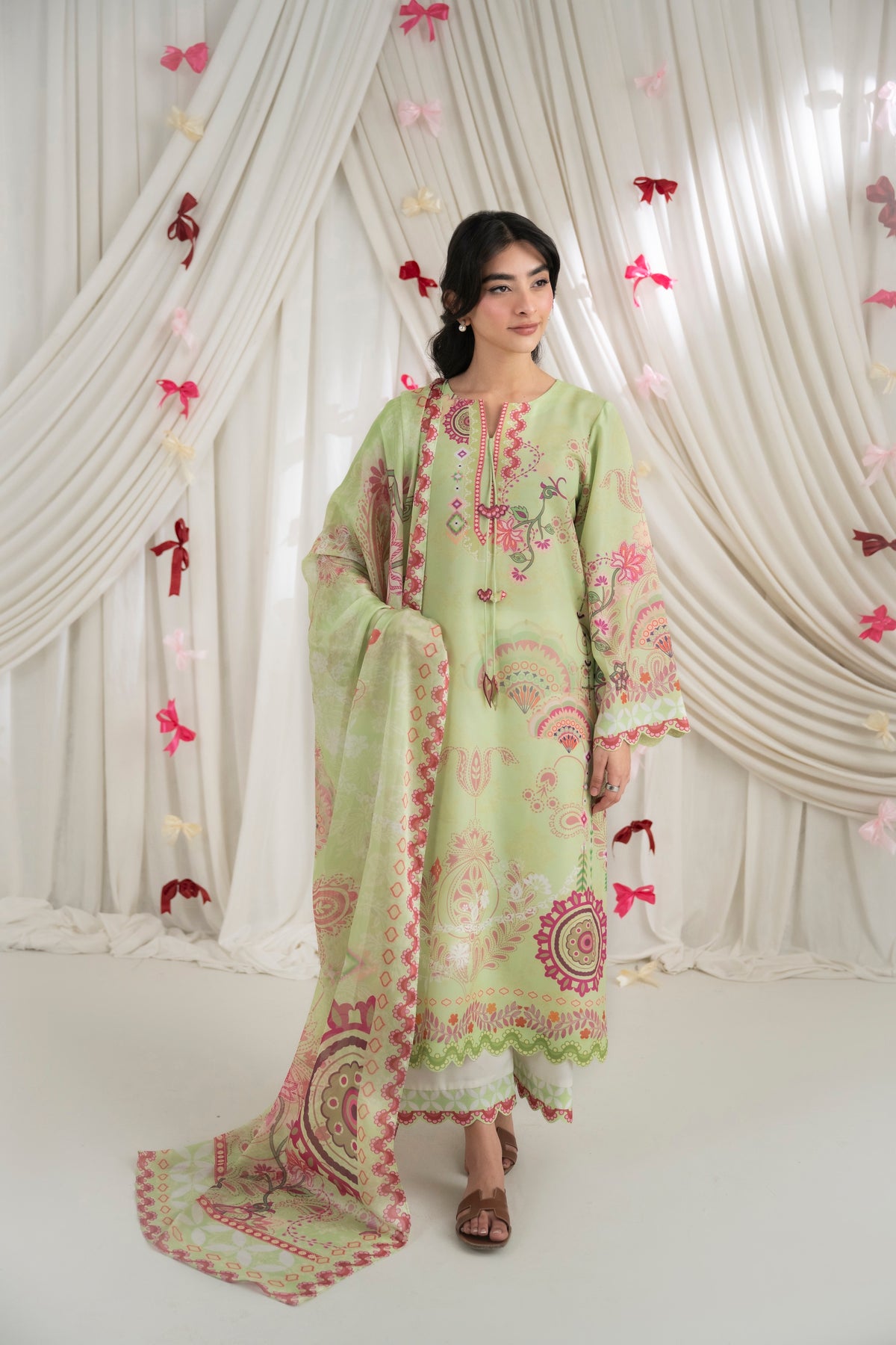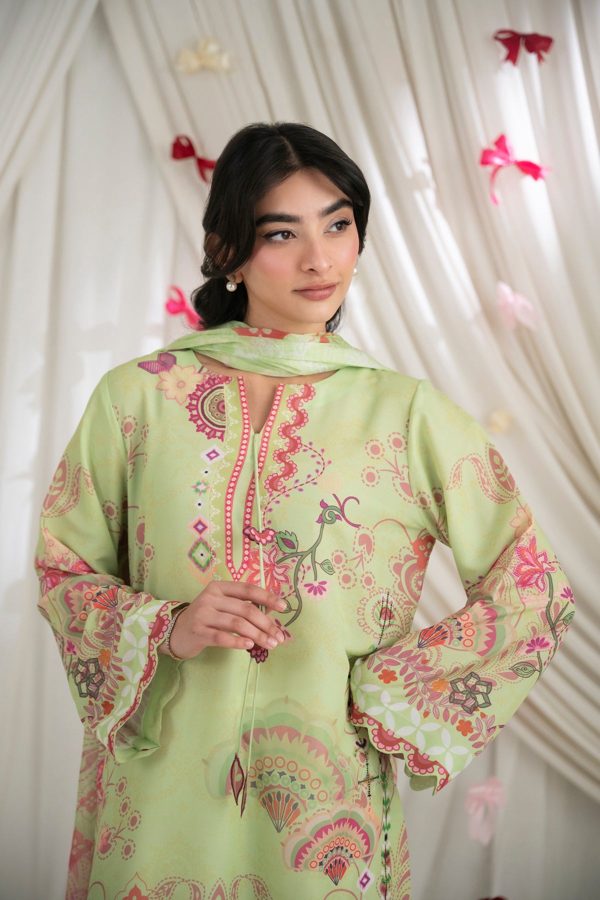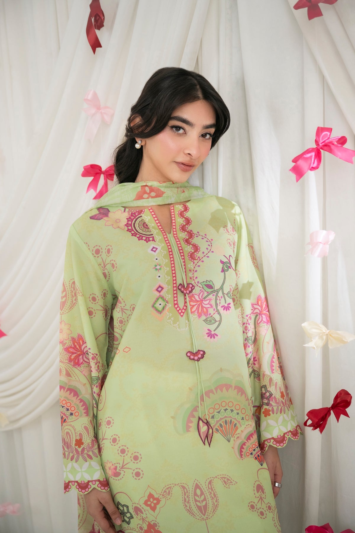 POPPY – Pistachio Green A vibrant printed two-piece set in pistachio green, featuring floral and traditional motifs, paired with matching pants. Perfect for effortless summer styling.
