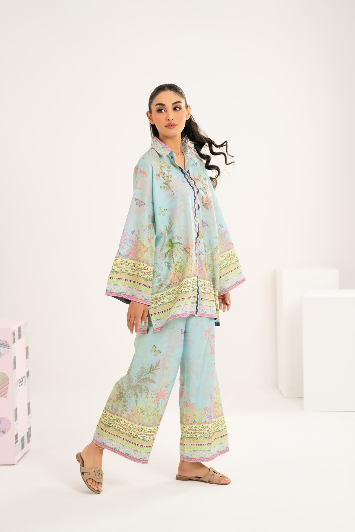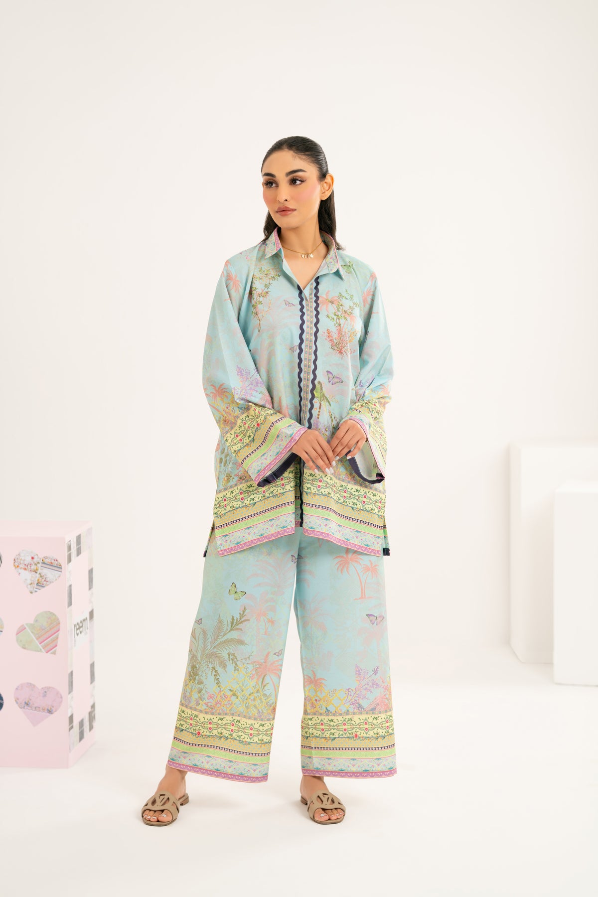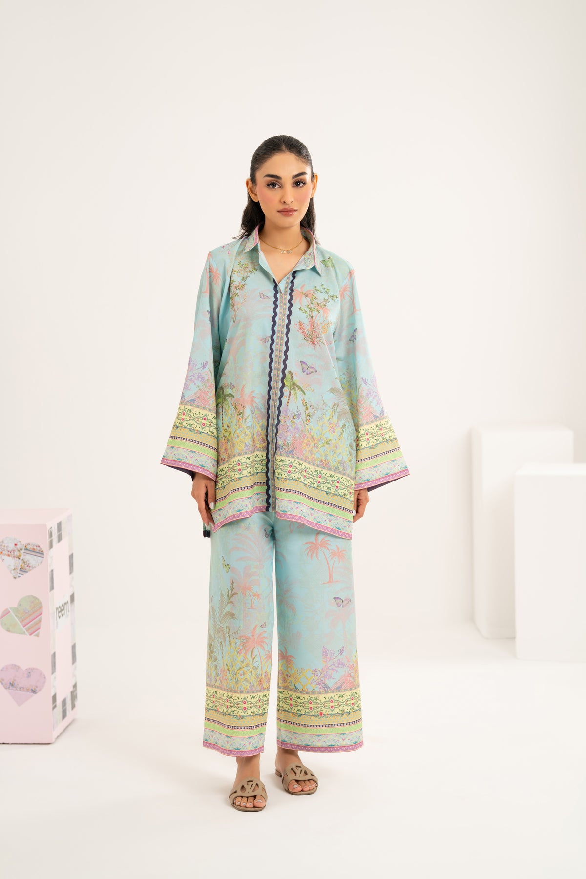 A soft aqua printed two-piece set featuring delicate florals and butterflies, finished with a structured collared neckline and relaxed culottes for an effortlessly chic look. Subtle scalloped detailing along the front adds a refined touch.